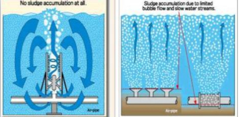 (2)搅拌力强、无淤泥堆积:在整个曝气池中形成强劲的混合搅拌效果,保持活性污泥始终处于悬浮状态,同时也使曝气池底无淤泥堆积。